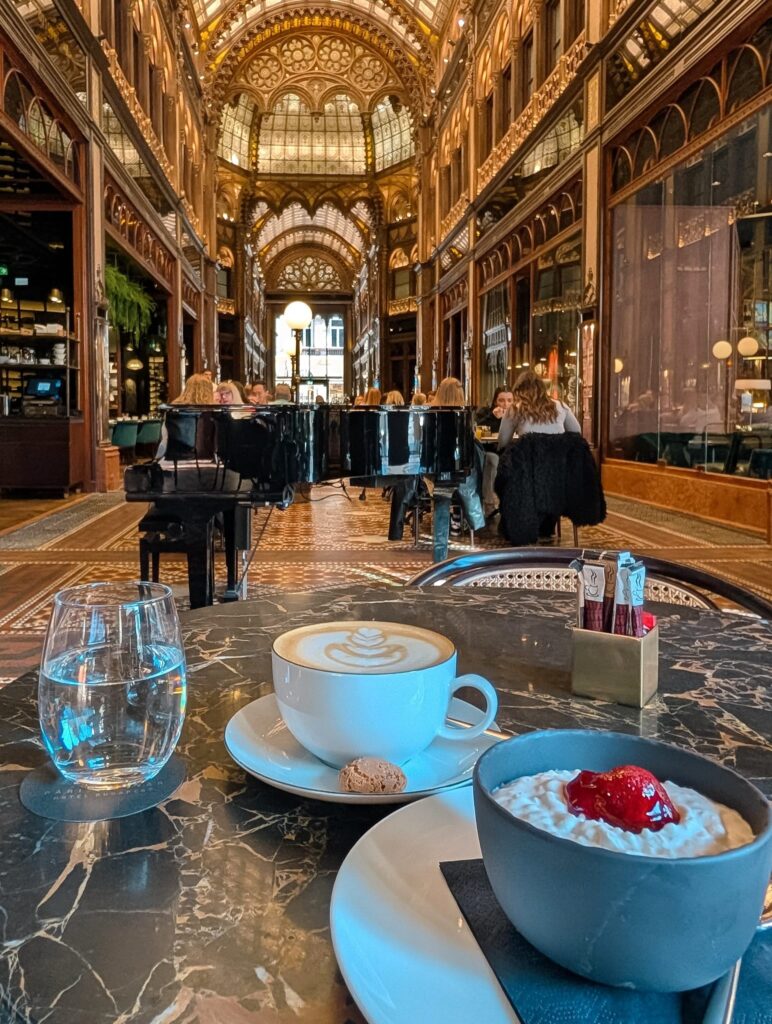 Partea bună e că la ora 8 deschide Parisi Passage Cafe. Mai puțin aglomerată, fără cozi, cu personal foarte foarte amabil care te așază, fără să ceri, la o masă de 4 persoane, chiar dacă ești singură, ca să te bucuri de interiorul interior Art Nouveau restaurat spectaculos. Și lumina, oh, lumina de aici! Lumina naturală cade prin cupolele de sticlă și face tot soiul de jocuri de umbre și lumini pe pereții sculptați, că nu mai știi dacă să te bucuri de desert sau de decor.